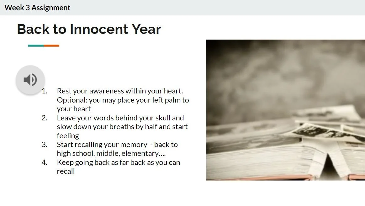 3) You have choice not to journey at this time alone, especially if you have childhood abuse. Please find the slides after the Week 3 Assignment. Seek an expert or contact me to explore appropriate options for you.